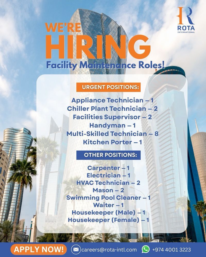 تعلن شركة روتا الدولية (ROTA International) عن توفر وظائف شاغرة في مجال صيانة المرافق في قطر 🇶🇦
