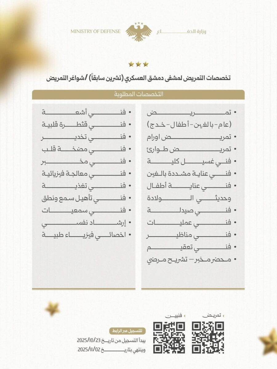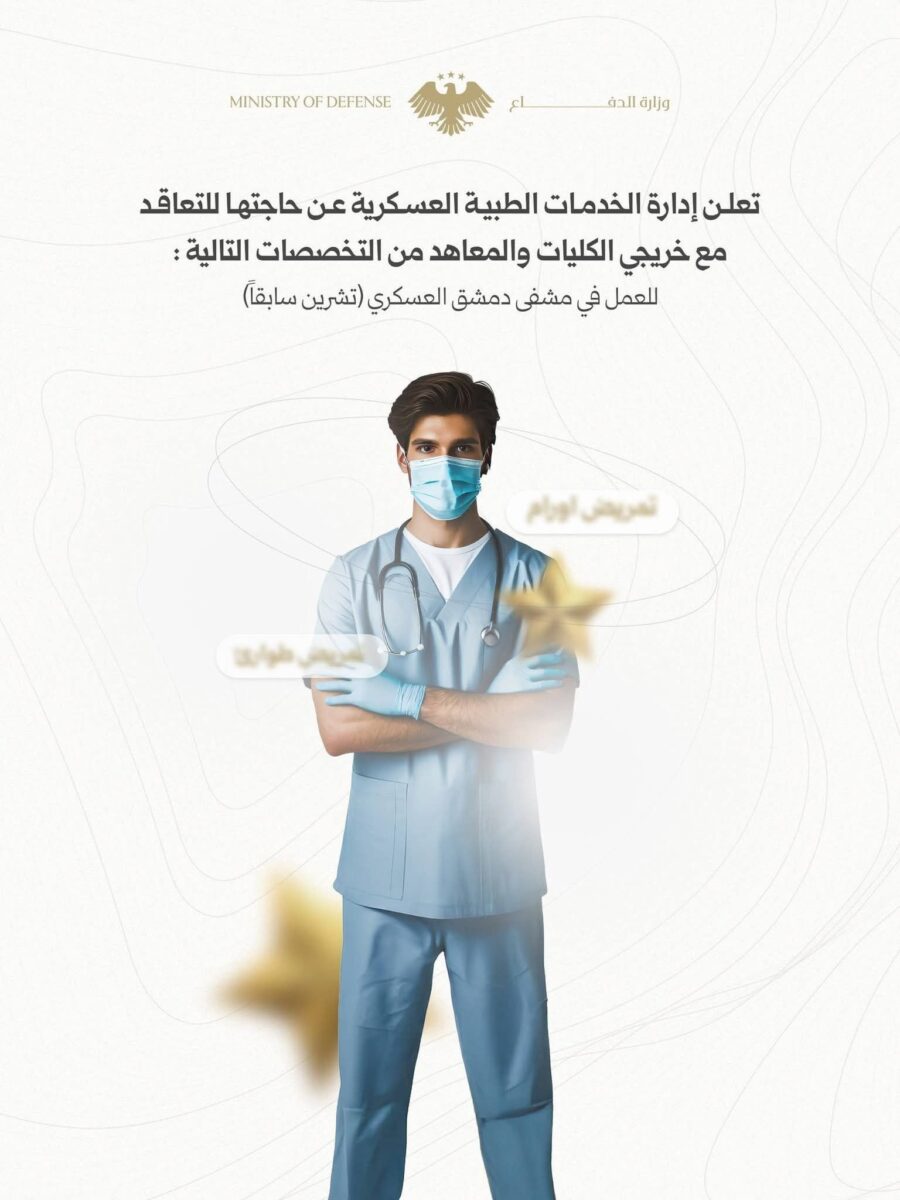 تُعلن الإدارة عن رغبتها في التعاقد مع خريجي الكليات والمعاهد الطبية من مختلف التخصصات للعمل في مشفى دمشق العسكري (تشرين سابقاً).