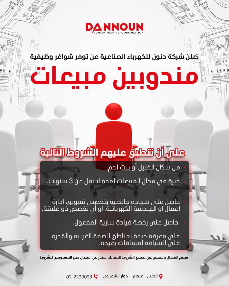 تُعلن شركة دنون للكهرباء الصناعية ومقرها في الخليل عن حاجتها لتعيين مندوبين مبيعات، وذلك ضمن الشروط التالية: