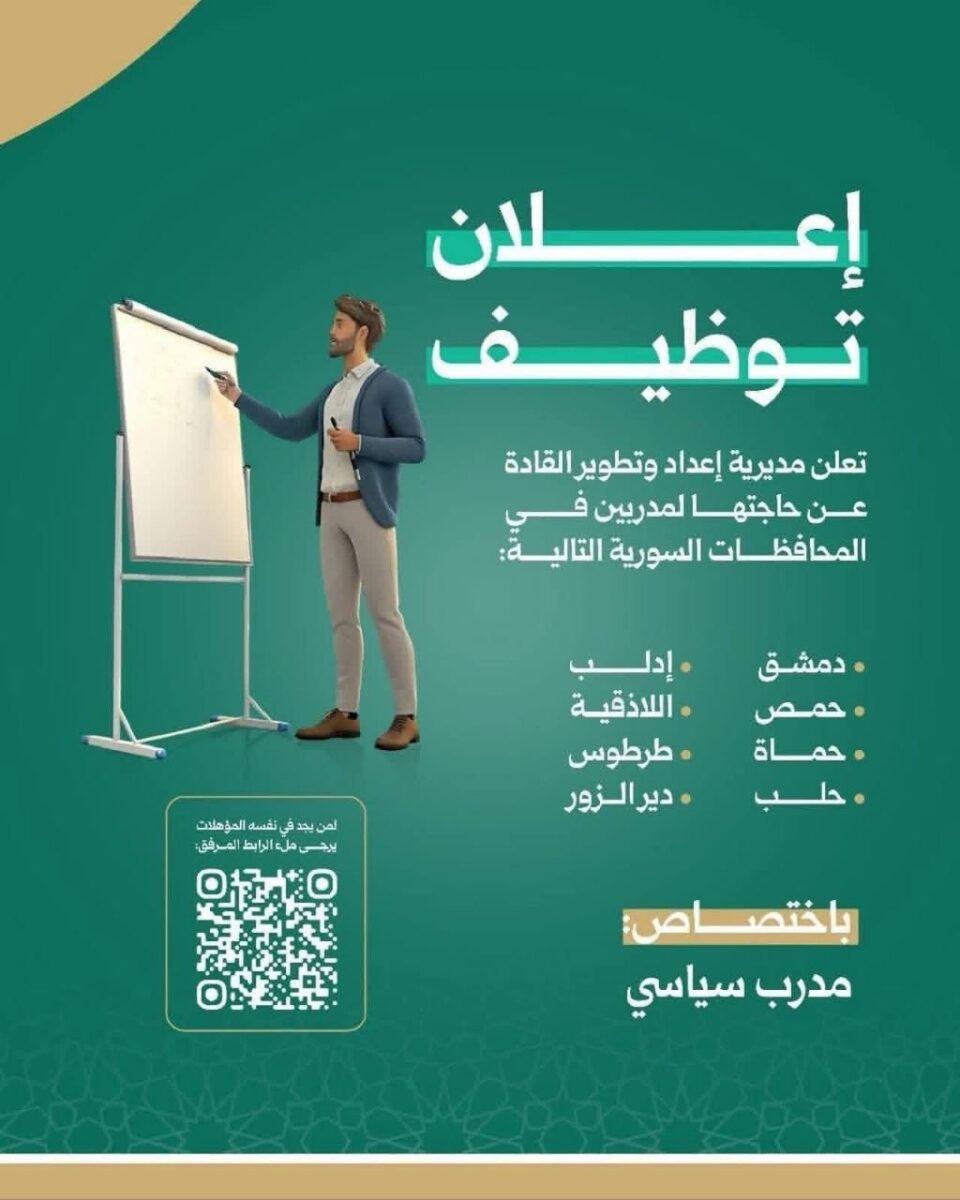تعلن مديرية إعداد وتطوير القادة عن حاجتها لتعيين مدربين سياسيين في المحافظات السورية التالية: