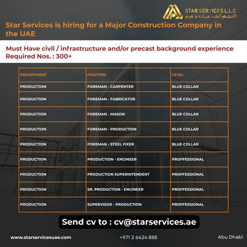 تعلن Star Services L.L.C عن فتح باب التوظيف لأكثر من 300 وظيفة في مجال الإنشاءات والبنية التحتية والخرسانة مسبقة الصب (Precast) لصالح شركة مقاولات كبرى في الإمارات العربية المتحدة.