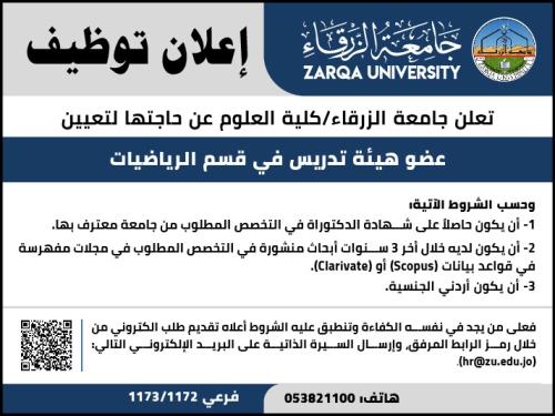 تُعلن جامعة الزرقاء / كلية العلوم عن حاجتها إلى تعيين عضو هيئة تدريس في قسم الرياضيات، ضمن الشروط التالية: