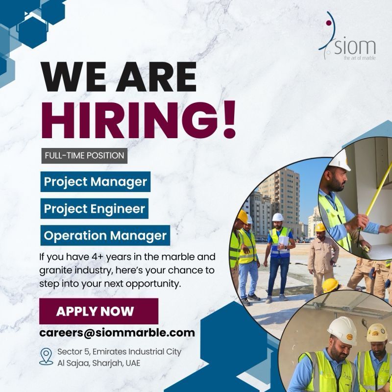 تعلن شركة Siom Marble الرائدة في مجال الرخام والجرانيت عن توفر شواغر وظيفية بدوام كامل للانضمام إلى فريقها المتميز في الشارقة – الإمارات العربية المتحدة.