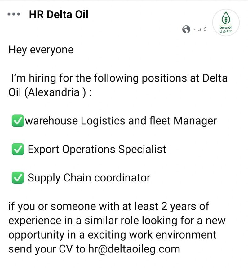✅ وظائف في شركة دلتا أويل – الإسكندرية