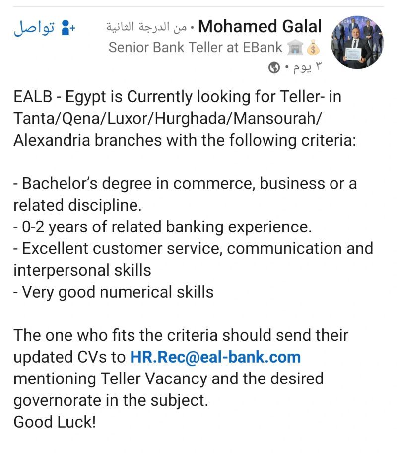 ✅ وظائف تيلر بنكي – بنك EALB