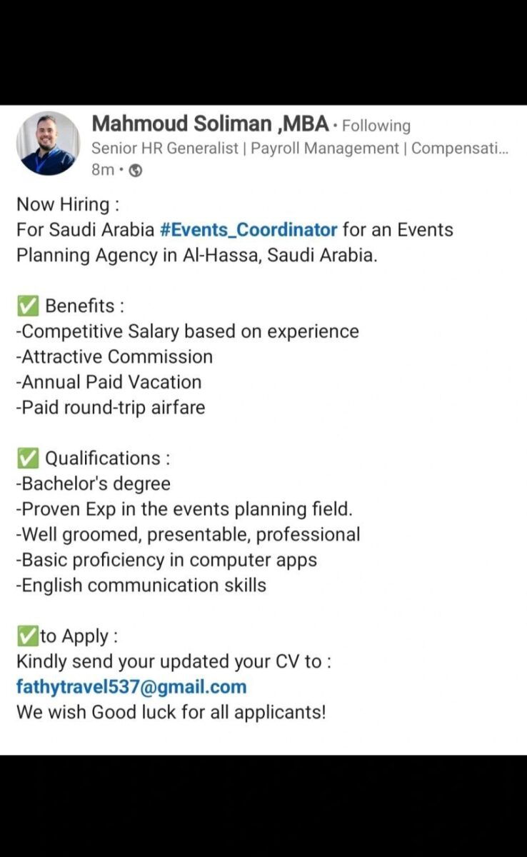 ✅ وظائف في السعودية – منسق فعاليات (Events Coordinator)