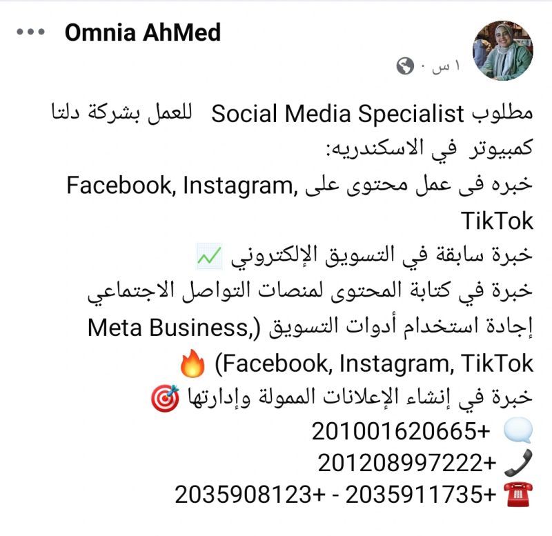 ✅ مطلوب Social Media Specialist – الإسكندرية