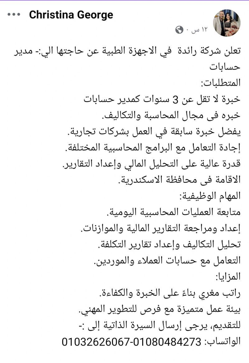 ✅ مدير حسابات – شركة أجهزة طبية (الإسكندرية)