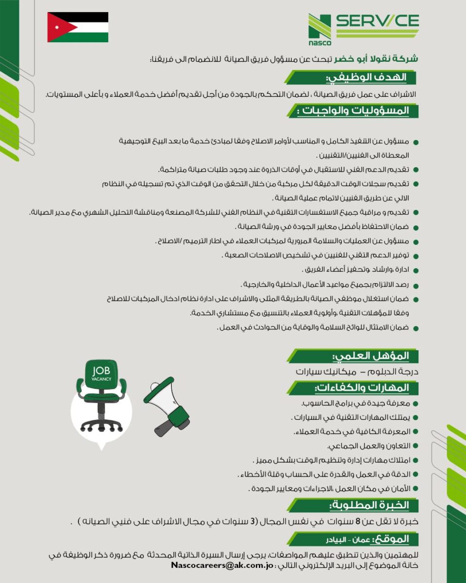 تعلن شركة نقولا أبو خضر (NASCO Service) عن حاجتها إلى مسؤول فريق الصيانة للانضمام إلى فريقها المتخصص في تقديم أفضل خدمات الصيانة لعملائها في الأردن.
