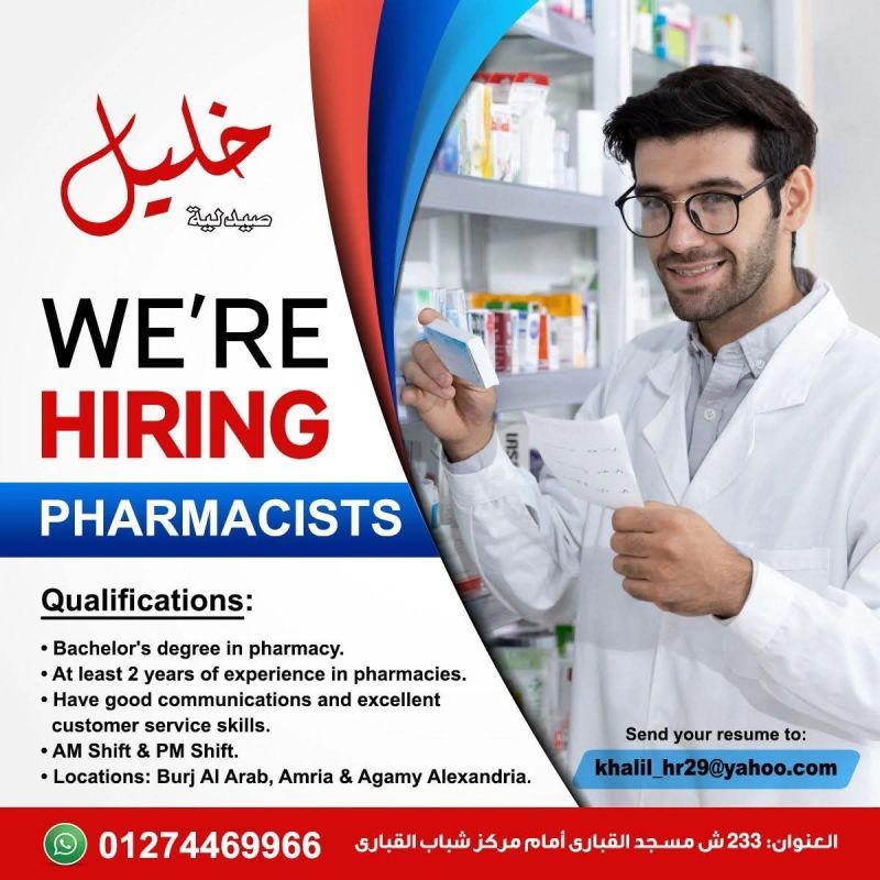 📢 صيدلية خليل تُعلن عن حاجتها إلى صيادلة مؤهلين للانضمام إلى فريقها المتميز!