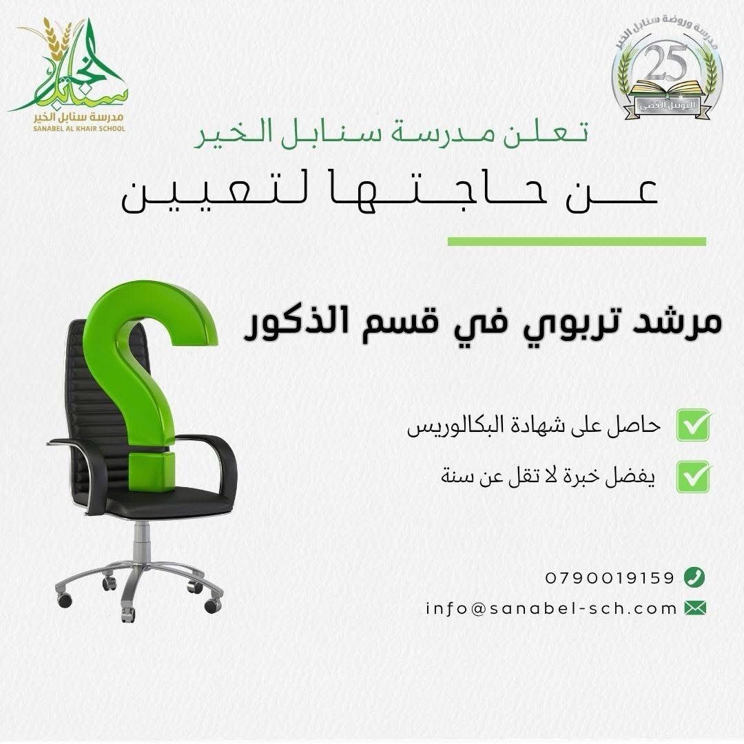 📢 تعلن مدرسة سنابل الخير عن حاجتها لتعيين مرشد تربوي في قسم الذكور.