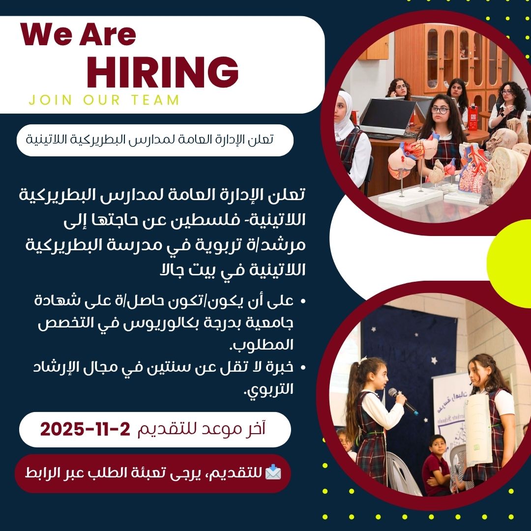 تعلن الإدارة العامة لمدارس البطريركية اللاتينية – فلسطين عن حاجتها إلى مرشد/ة تربوية للعمل في مدرسة البطريركية اللاتينية في بيت جالا.