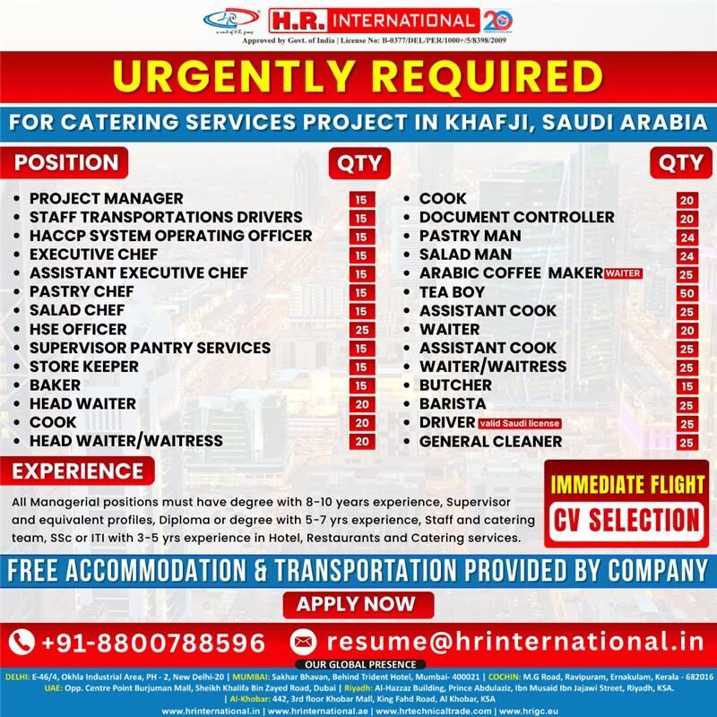 تعلن شركة H.R. International عن توفر عدد كبير من الوظائف لمشروع خدمات التموين في مدينة الخفجي – المملكة العربية السعودية.