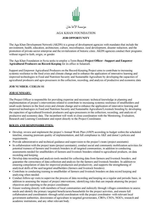 مسؤول\ة مشروع – دعم وتمكين المنتجين الزراعيين في حفظ السجلات