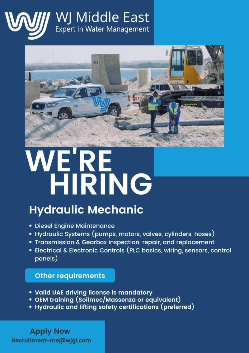 هل تمتلك خبرة في صيانة الأنظمة الهيدروليكية والمعدات الثقيلة؟ هذه فرصتك للانضمام إلى فريق WJ Middle East الرائد في إدارة المياه.