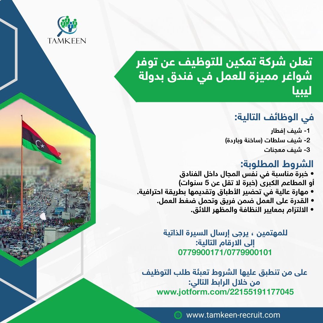 تعلن شركة تمكين للتوظيف عن توفر شواغر مميزة للعمل في فندق بدولة ليبيا في الوظائف التالية: