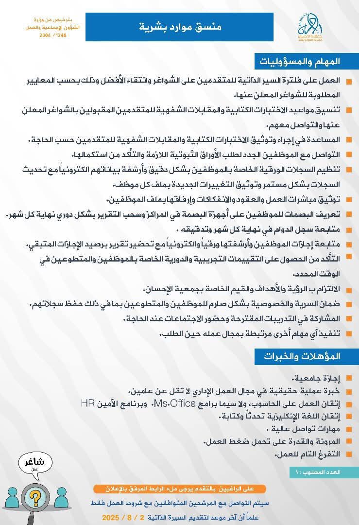 تعلن جمعية الإحسان الخيرية التنموية عن توفر شاغر وظيفي ضمن قسم الموارد البشرية بمسمى: منسق موارد بشرية.