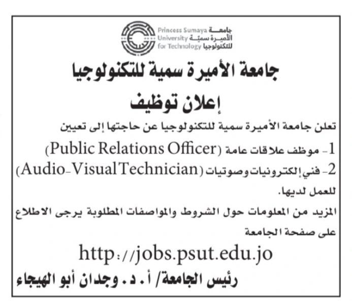إعلان توظيف في جامعة الأميرة سمية للتكنولوجيا – وظائف علاقات عامة وفني إلكترونيات وصوتيات