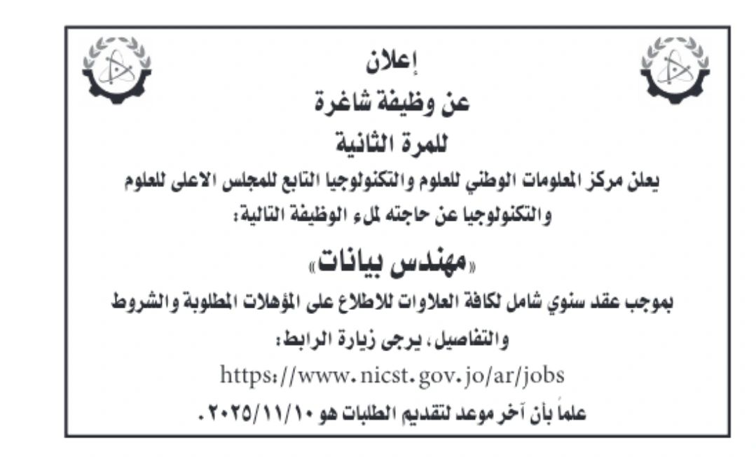 يعلن مركز المعلومات الوطني للعلوم والتكنولوجيا التابع للمجلس الأعلى للعلوم والتكنولوجيا عن حاجته لتعيين: