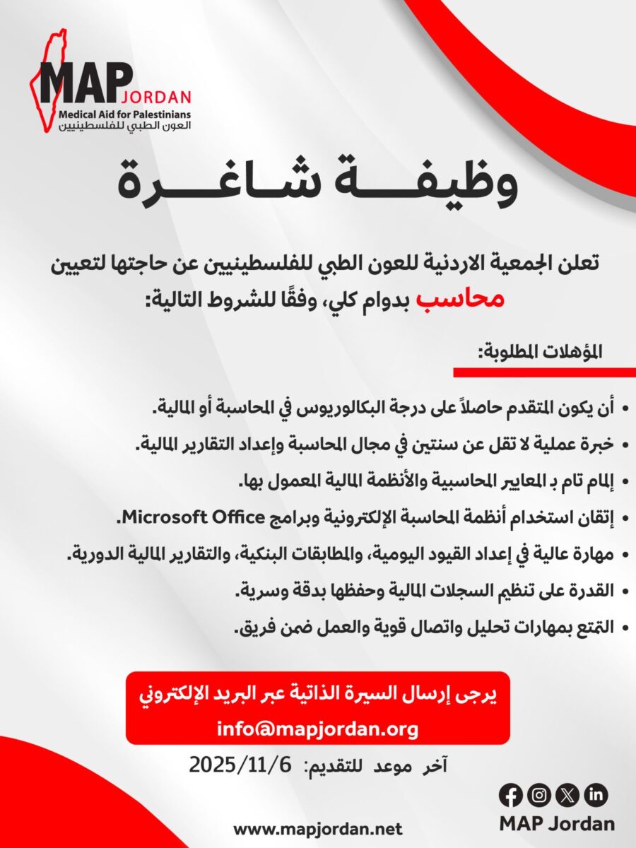 تعلن الجمعية الأردنية للعون الطبي للفلسطينيين عن حاجتها لتوظيف محاسب وفق الشروط التالية: