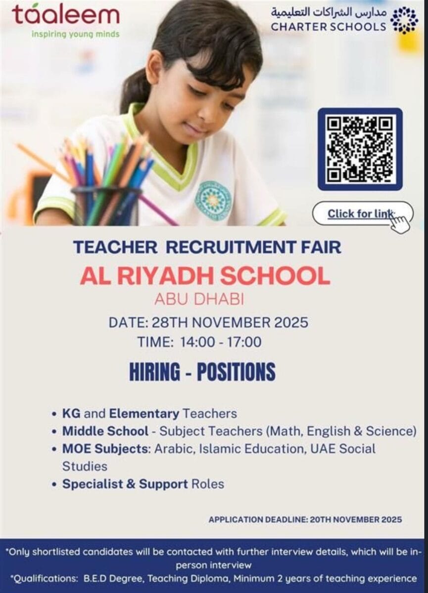 تعلن مدرسة الرياض (Al Riyadh Charter School) – إحدى مدارس تعليم للشراكات التعليمية في أبوظبي – عن فتح باب التوظيف للمعلمين المؤهلين والطموحين الذين يسعون لإحداث فرق حقيقي في حياة الطلبة.