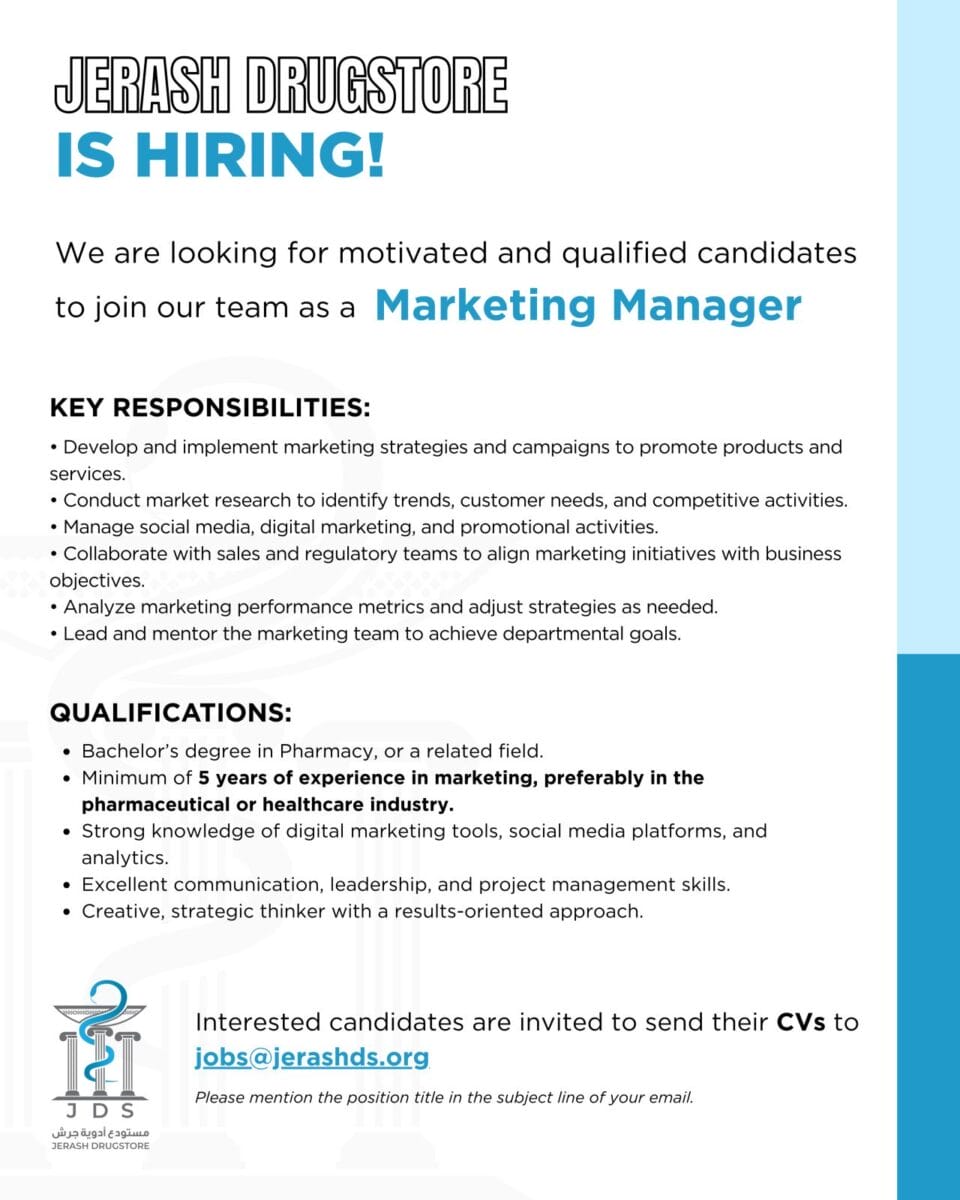 هل لديك خبرة في التسويق؟ هل ترغب في الانضمام إلى فريق محترف وبيئة عمل ديناميكية؟ نقدم لك فرصة للعمل كـ مدير تسويق في صيدلية جرش.