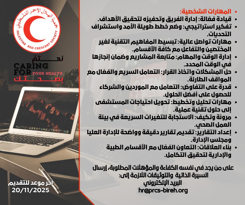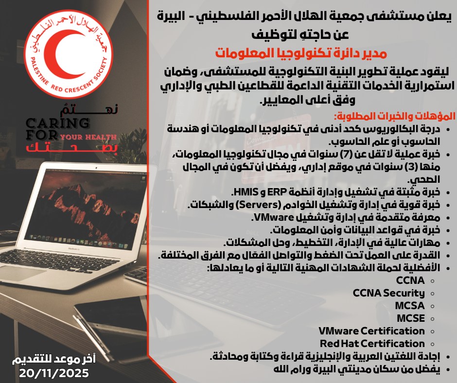 يعلن مستشفى جمعية الهلال الأحمر الفلسطيني – فرع البيرة عن حاجته لتعيين مدير دائرة تكنولوجيا المعلومات لقيادة تطوير البنية التكنولوجية وضمان استمرارية الخدمات التقنية للقطاعين الطبي والإداري.