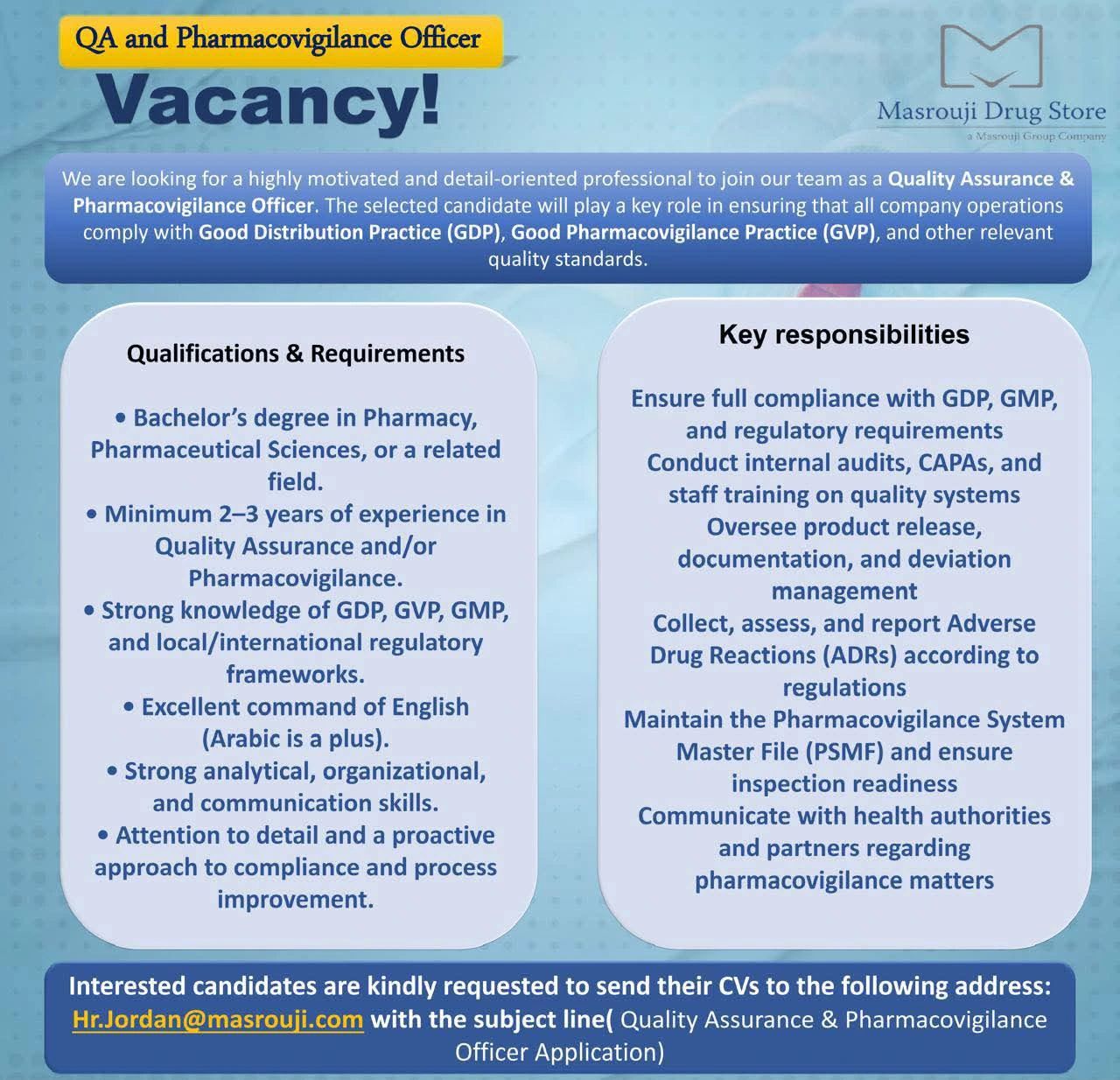 تعلن Masrouji Drug Store عن حاجتها لتعيين موظف Quality Assurance & Pharmacovigilance Officer للانضمام إلى فريقها في عمّان.