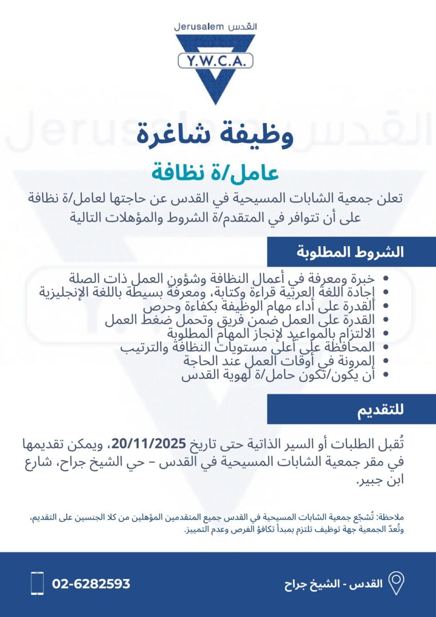 📢 فرصة عمل – عامل/ة نظافة – جمعية الشابات المسيحية – القدس