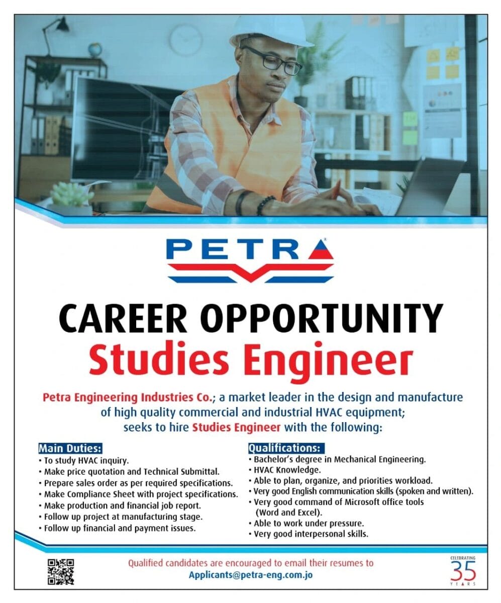 ✅ شركة بترا الهندسية (Petra Engineering Industries Co.)، الرائدة في تصميم وتصنيع معدات التكييف والتبريد الصناعي والتجاري، تعلن عن حاجتها إلى مهندس دراسات (Studies Engineer) للانضمام إلى فريقها المتخصص.