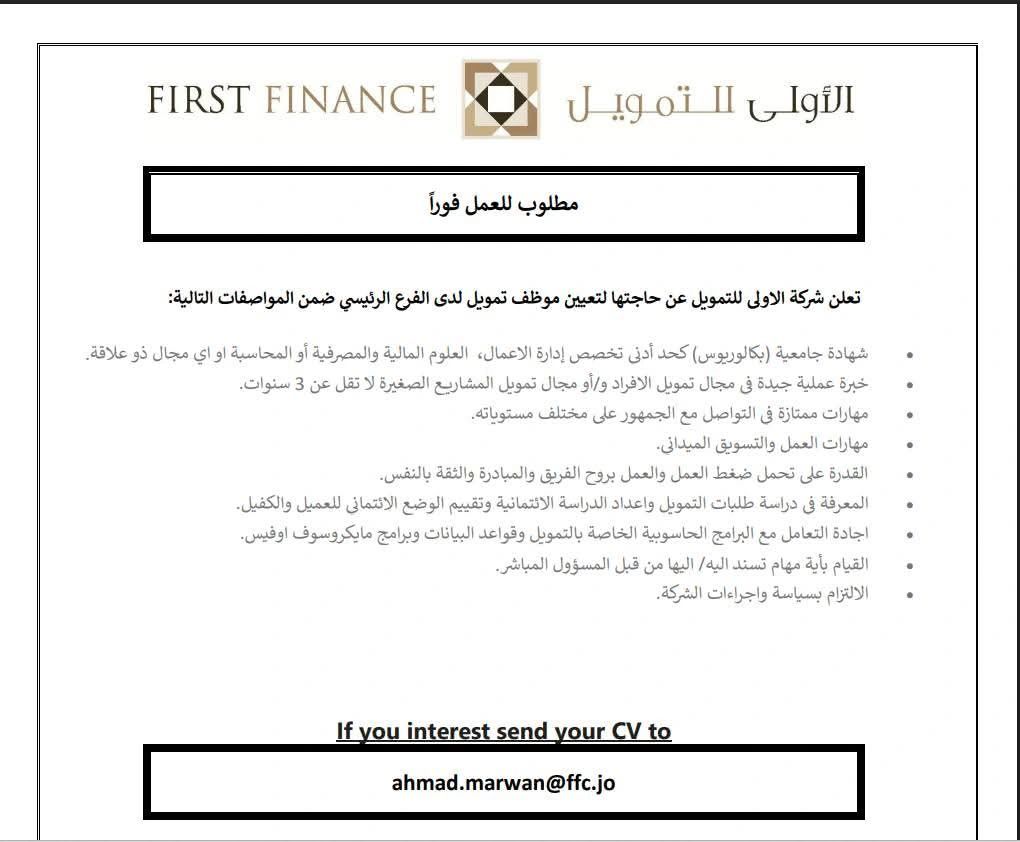 ✅ شركة الأولى للتمويل (First Finance Co.) تعلن عن حاجتها لتعيين موظف تمويل لدى الفرع الرئيسي ضمن الشروط التالية: