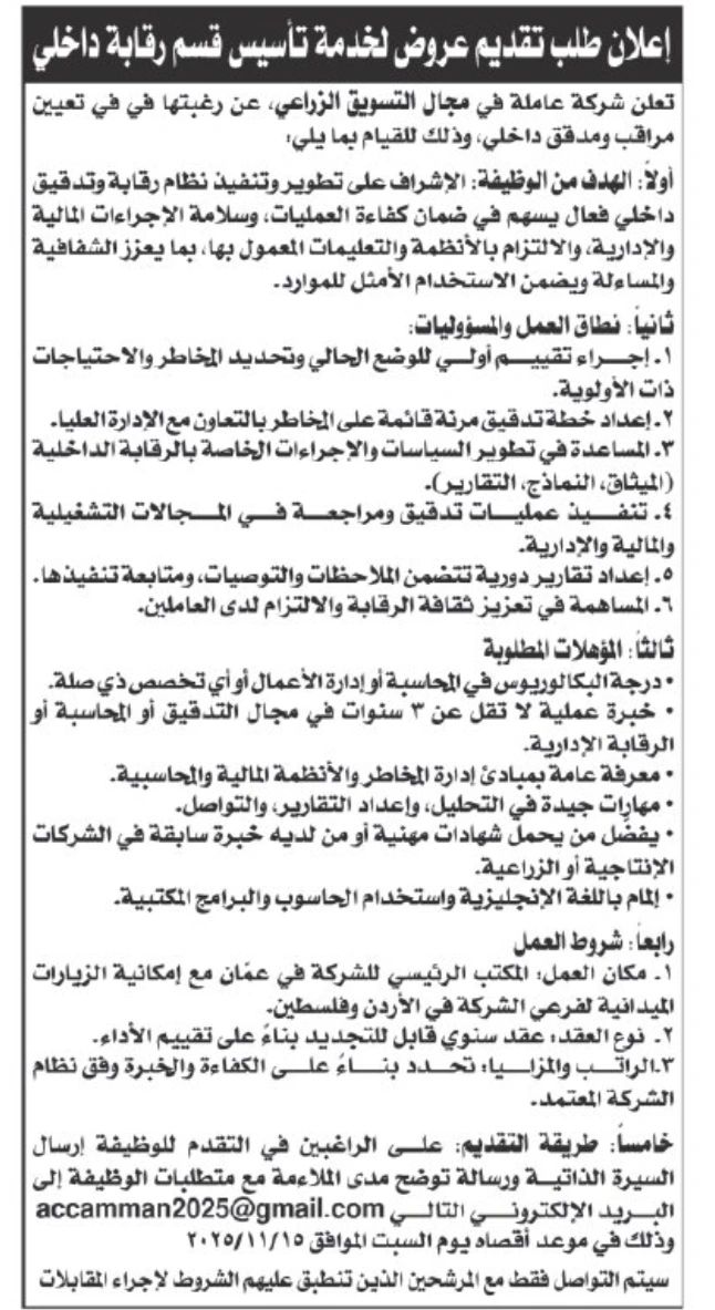 تعلن شركة عاملة في مجال التسويق الزراعي عن رغبتها في تعيين مراقب ومدقق داخلي لتأسيس قسم رقابة داخلية والإشراف على تطوير وتنفيذ نظام تدقيق فعال يضمن كفاءة العمليات وسلامة الإجراءات المالية والإدارية.