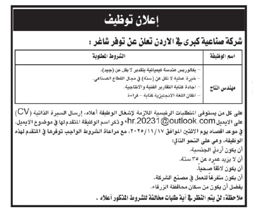 تعلن شركة صناعية كبرى في الأردن عن توفر شاغر وظيفي بمسمى: