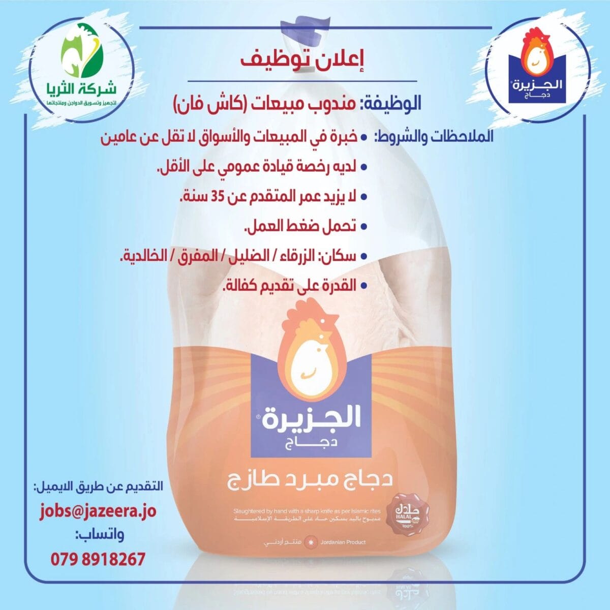 تعلن شركة الجزيرة للدواجن عن حاجتها إلى مندوب مبيعات (كاش فان) للانضمام إلى فريقها الحيوي.