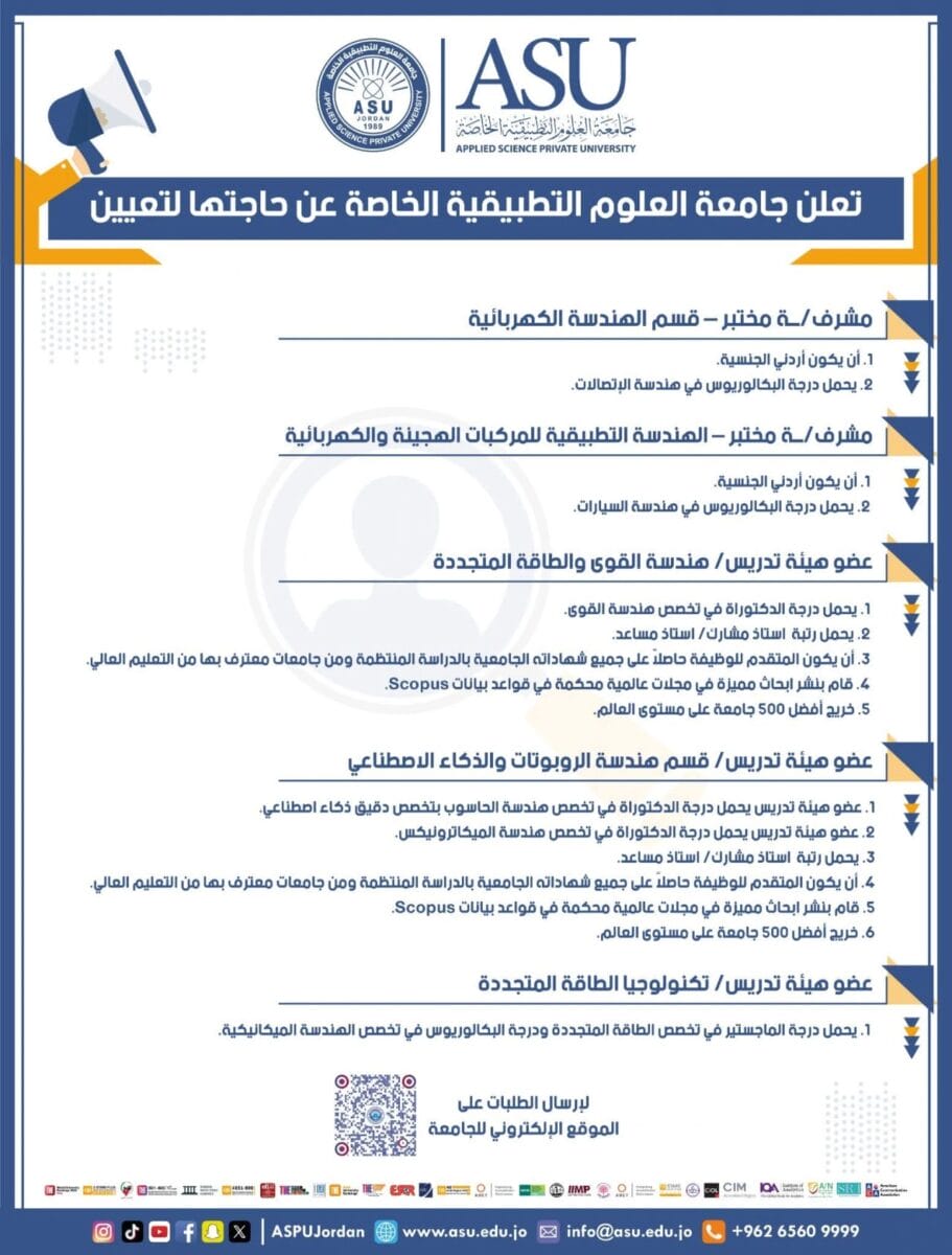 🎓 إعلان توظيف من جامعة العلوم التطبيقية الخاصة (ASU)