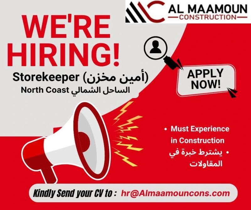 تعلن شركة المعمون للمقاولات (AL MAAMOUN Construction) عن حاجتها إلى أمين مخزن (Storekeeper) للعمل في الساحل الشمالي.