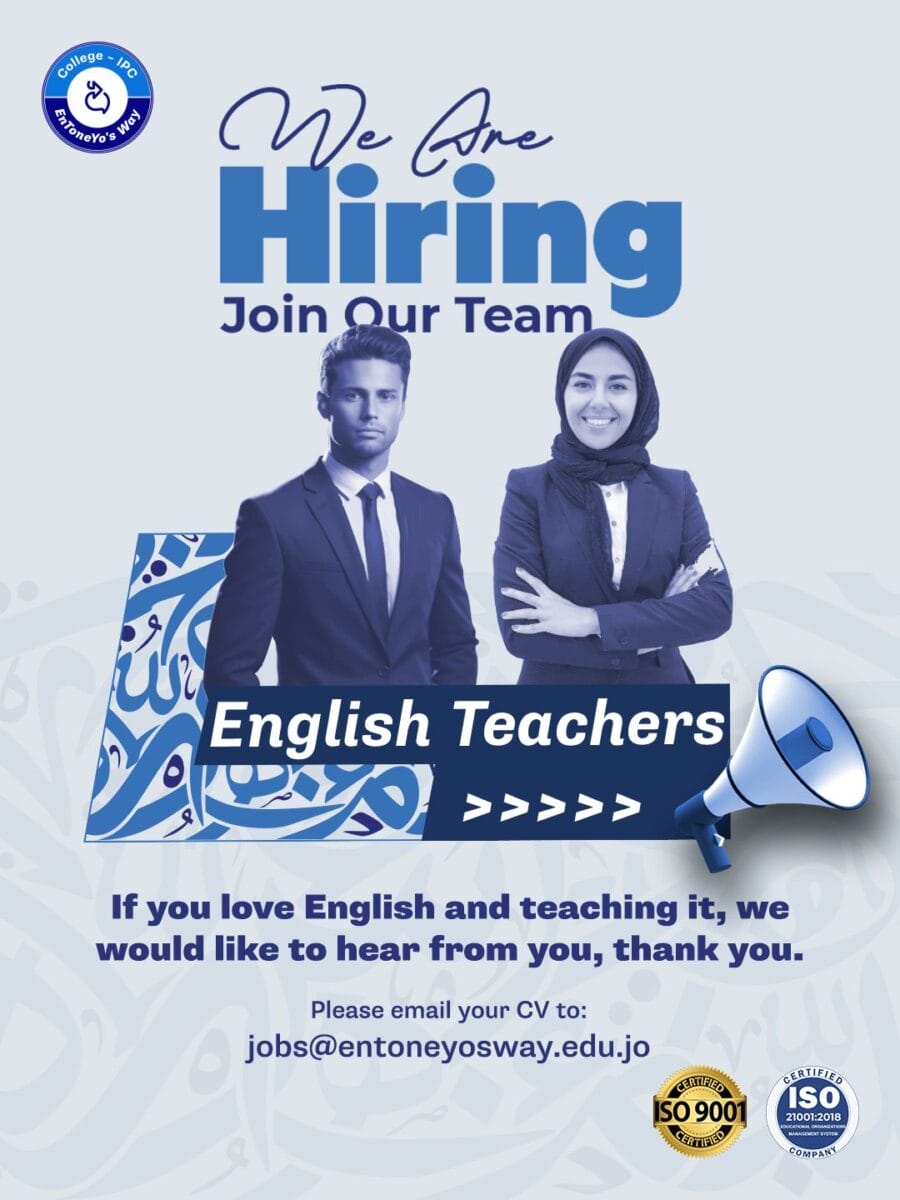تعلن EnToneYo’s Way College عن توفر وظائف جديدة لمعلمين لغة إنجليزية في عمّان – الأردن، للانضمام إلى بيئة عمل إيجابية وملهمة: