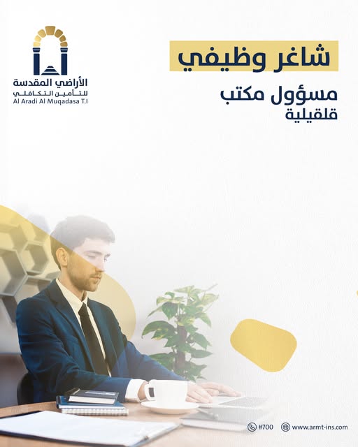 شركة الأراضي المقدسة للتأمين التكافلي تعلن عن حاجتها لتعيين مسؤول مكتب – قلقيلية، للعمل ضمن طاقم إداري محترف وبخبرات متقدمة في مجال التأمين.