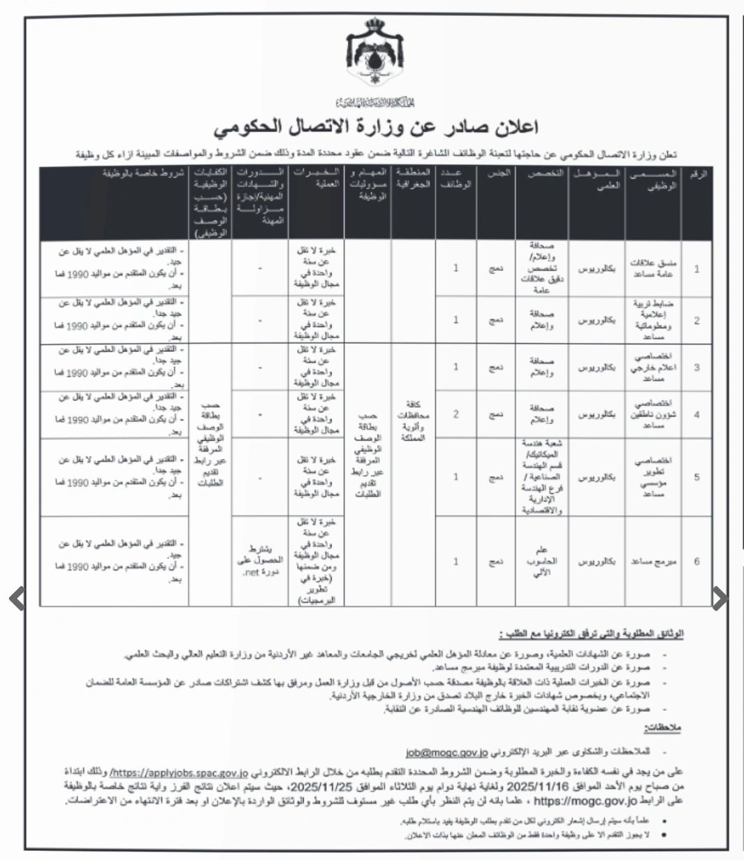 تعلن وزارة الاتصال الحكومي عن حاجتها لتعيين عدد من الموظفين في تخصصات مختلفة ضمن كادرها الإداري والفني، وفق الشروط والمؤهلات الموضحة بالإعلان الرسمي.