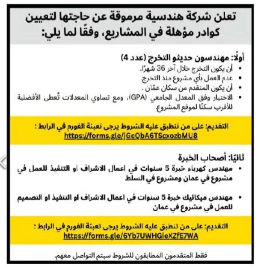 فرص توظيف هندسية شاغرة في عمان والسلط