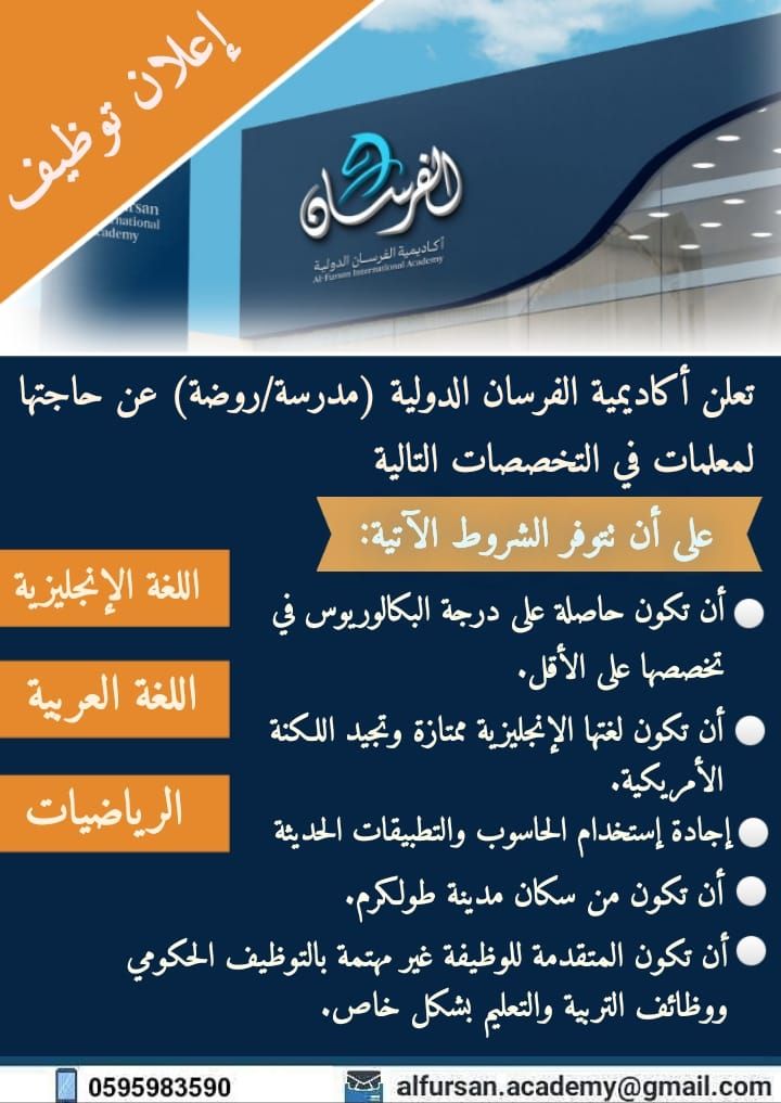 تعلن أكاديمية الفرسان الدولية (مدرسة/روضة) عن حاجتها إلى مدرسات في التخصصات التالية: