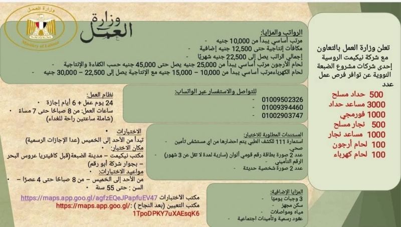 ✅ وزارة العمل المصرية تعلن بالتعاون مع شركة تركيجيت السويسرية عن فرص عمل كبرى بشركات صناعية في مجالات الحدادة والنجارة واللحام وغيرها، برواتب مجزية وحوافز مجتمعية.