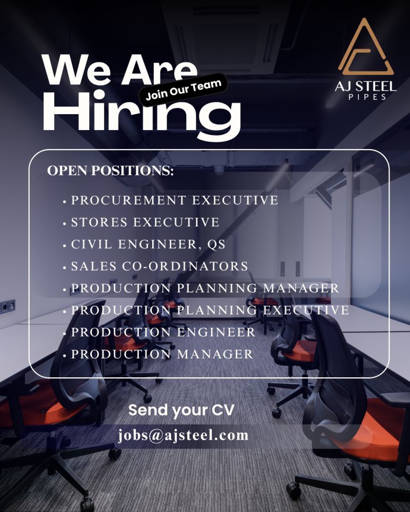 شركة AJ Steel Pipes تعلن عن فرص عمل مميزة للانضمام إلى فريقها المحترف في بيئة عمل متطورة.