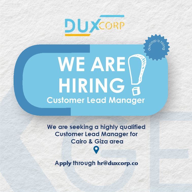 تعلن DuxCorp عن حاجتها إلى مدير قادة العملاء للعمل في منطقتي القاهرة والجيزة ضمن بيئة احترافية وديناميكية.