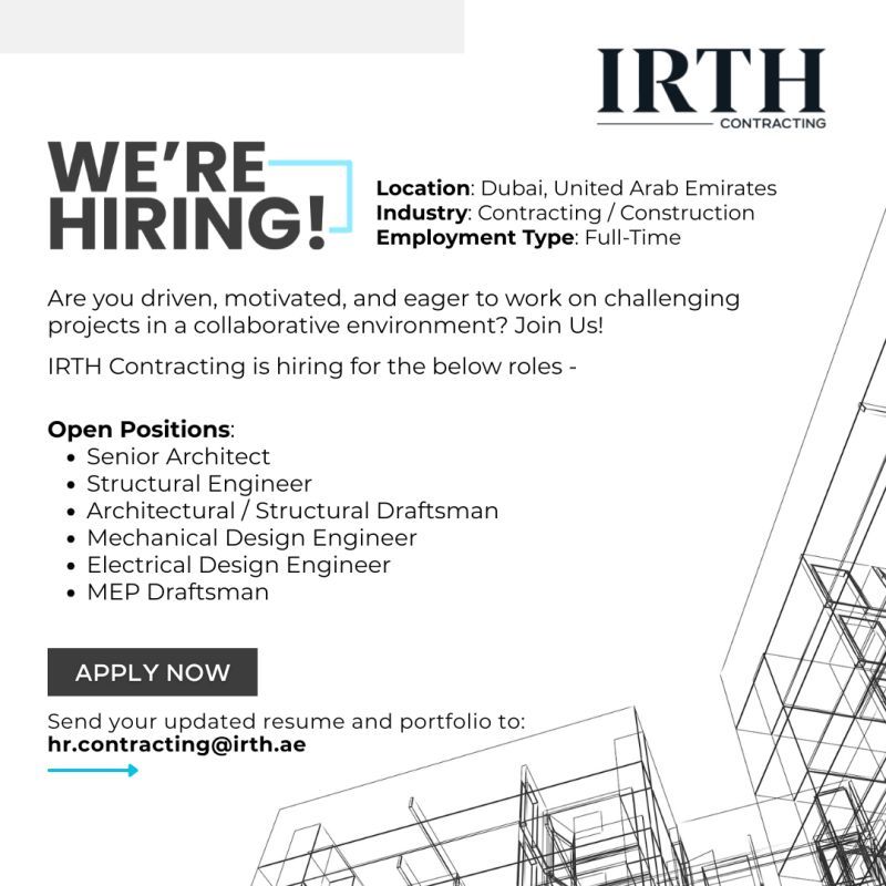 شركة IRTH Contracting في دبي تعلن عن فرص توظيف جديدة في بيئة عمل احترافية ومليئة بالتحديات. إذا كنت طموحًا وتسعى للانضمام إلى فريق بناء مشاريع كبرى، هذه فرصتك!