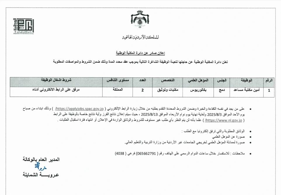 📢 تعلن دائرة المكتبة الوطنية عن حاجتها لتعيين “أمين مكتبة مساعد” بعقد محدد المدة، وفقًا للتفاصيل التالية: