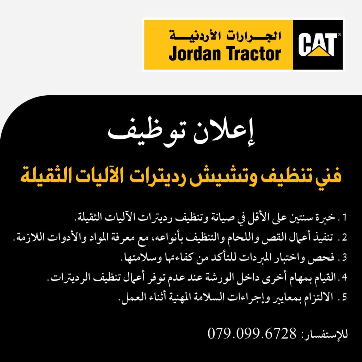 📣 الجرارات الأردنية تعلن عن حاجتها لتوظيف فني تنظيف وتشخيص رديترات الآليات الثقيلة للانضمام لفريقها المتخصص.