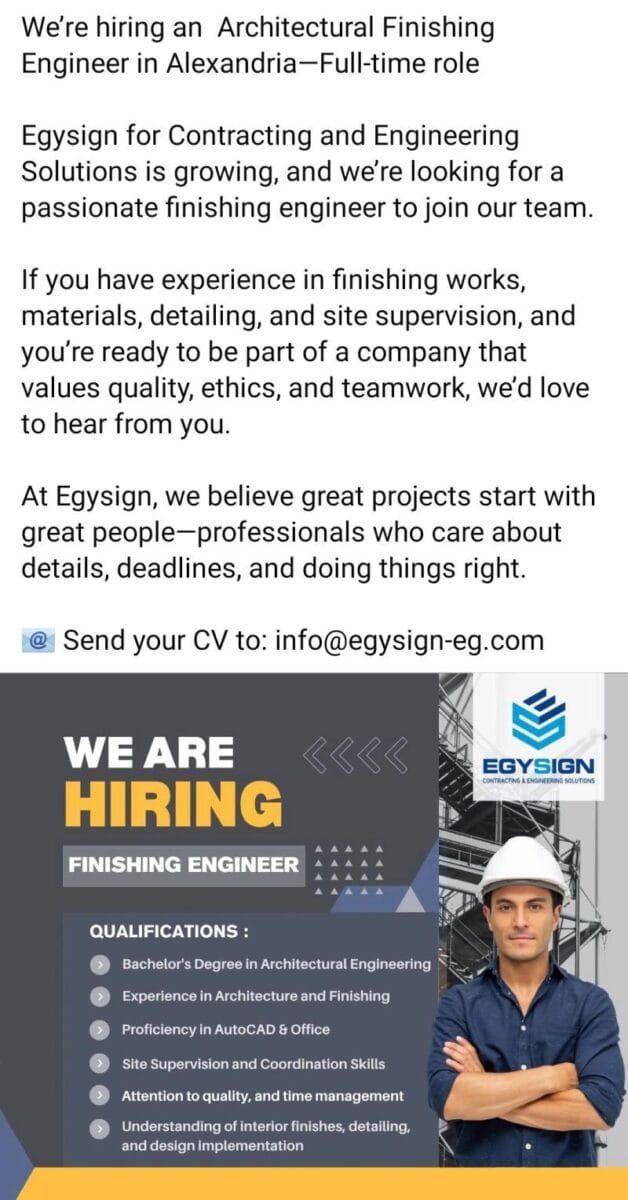 تعلن شركة EGYsign للمقاولات والحلول الهندسية عن حاجتها إلى مهندس تشطيبات معمارية للعمل بدوام كامل في مدينة الإسكندرية، وذلك ضمن فريق هندسي محترف في بيئة عمل تعتمد على الجودة والدقة والتعاون.