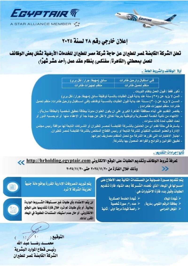 أعلنت شركة مصر للطيران للخدمات الأرضية عن فتح باب التقديم لشغل عدة وظائف للعمل بمحطتي القاهرة و سنتكس بنظام عقد عمل لمدة أحد عشر شهرًا، وذلك ضمن الإعلان الخارجي رقم (28) لسنة 2025.