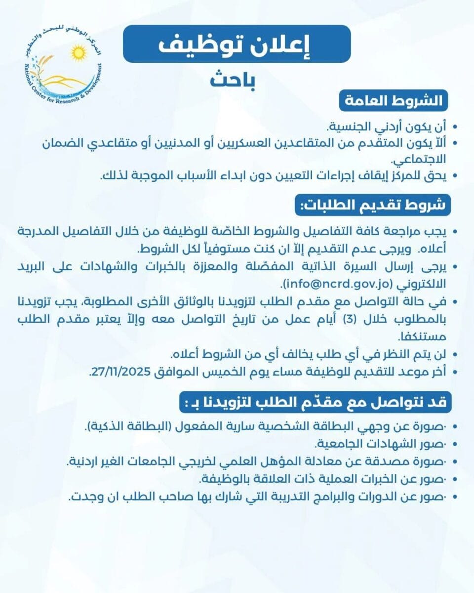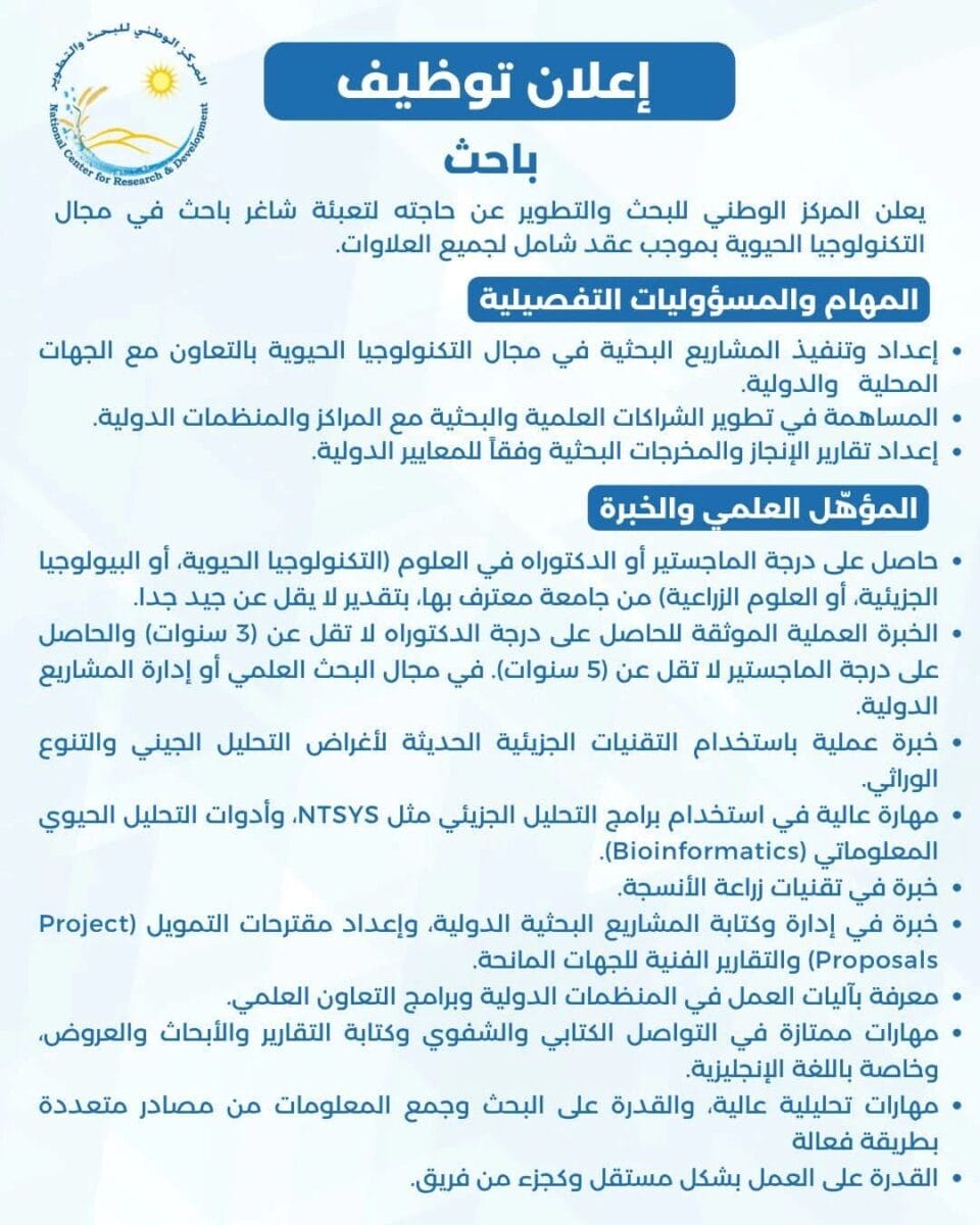 يعلن المركز الوطني للبحث والتطوير عن فرصة عمل مميزة لعام 2025 ضمن وظائف اليوم في الأردن بتعيين باحث في التكنولوجيا الحيوية للعمل في مشاريع بحثية وطنية ودولية.